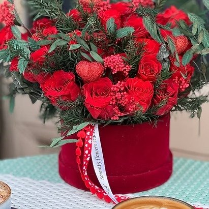 Preserved flowers and infinity roses in a red velvet box: